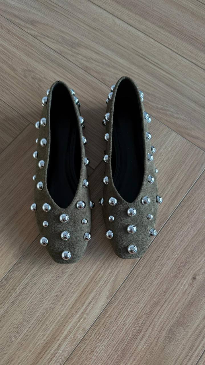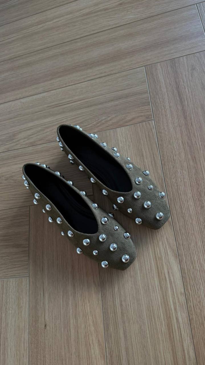 Apportez une touche d’audace à votre tenue avec ces ballerines en suédine ornées de multiples clous métalliques. Leur design moderne et graphique offre un style unique, mêlant féminité et caractère.