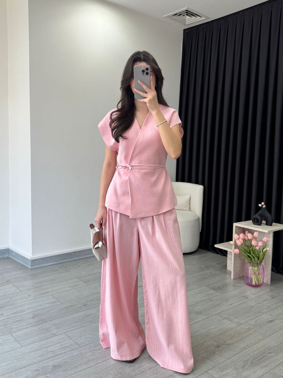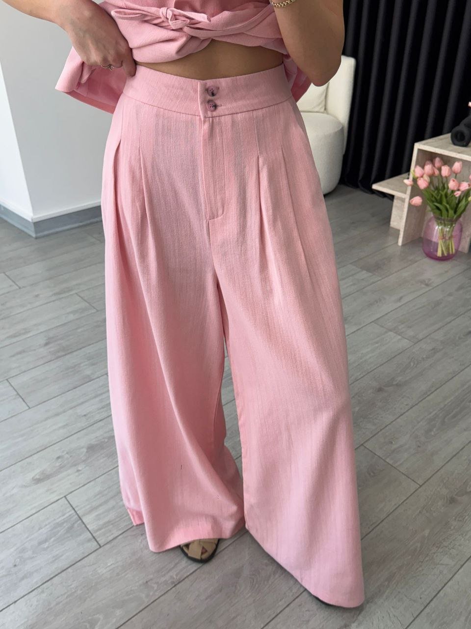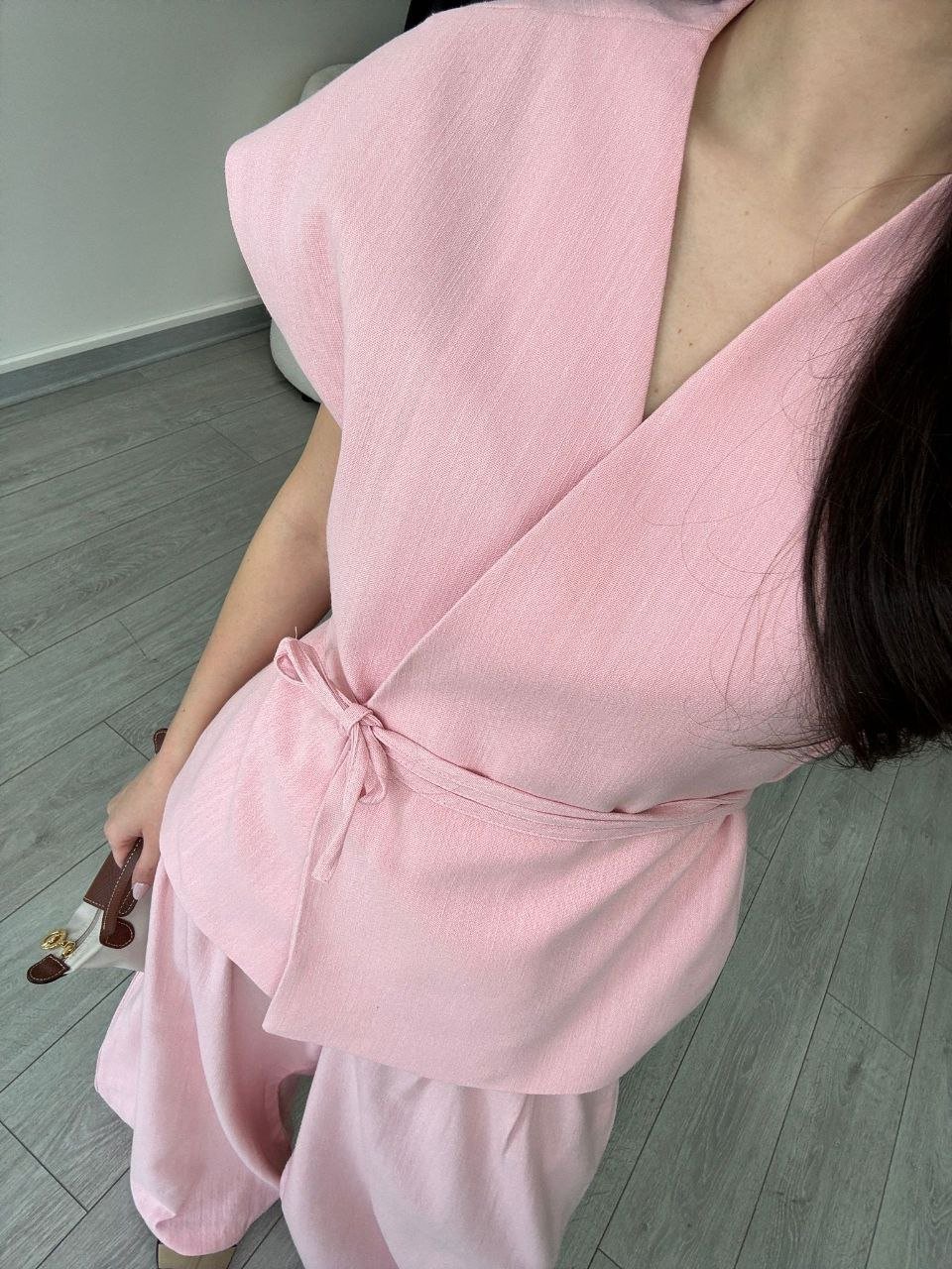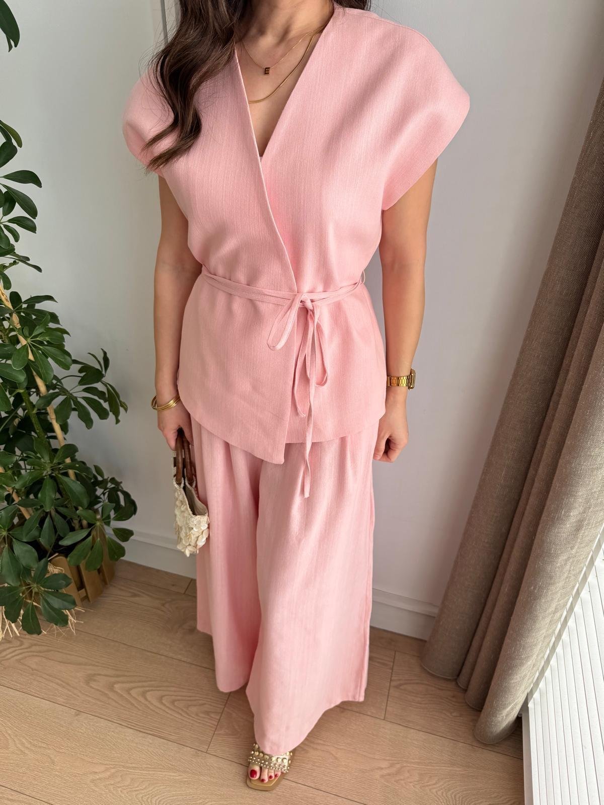 Ensemble gilet pantalon en lin rose