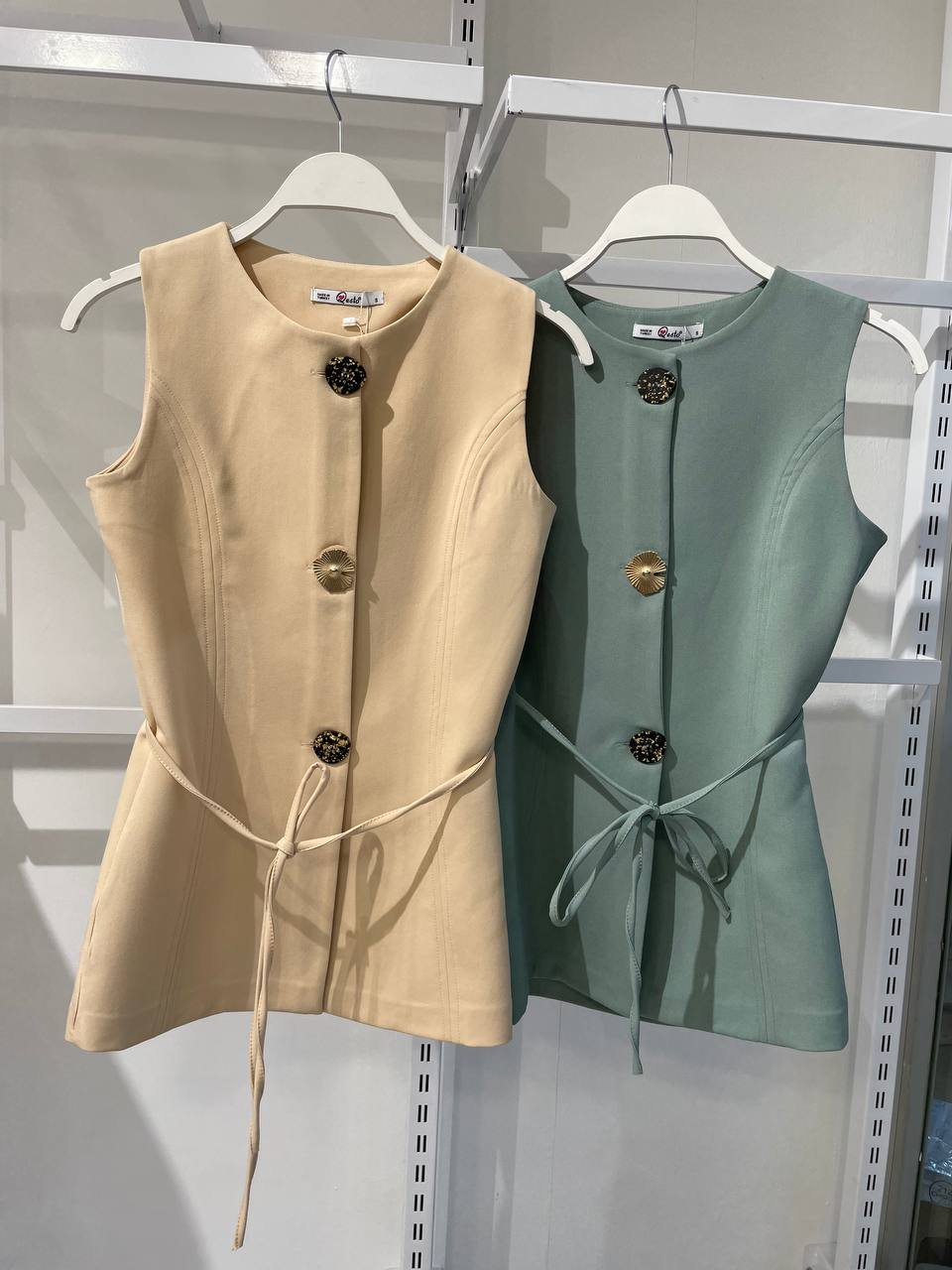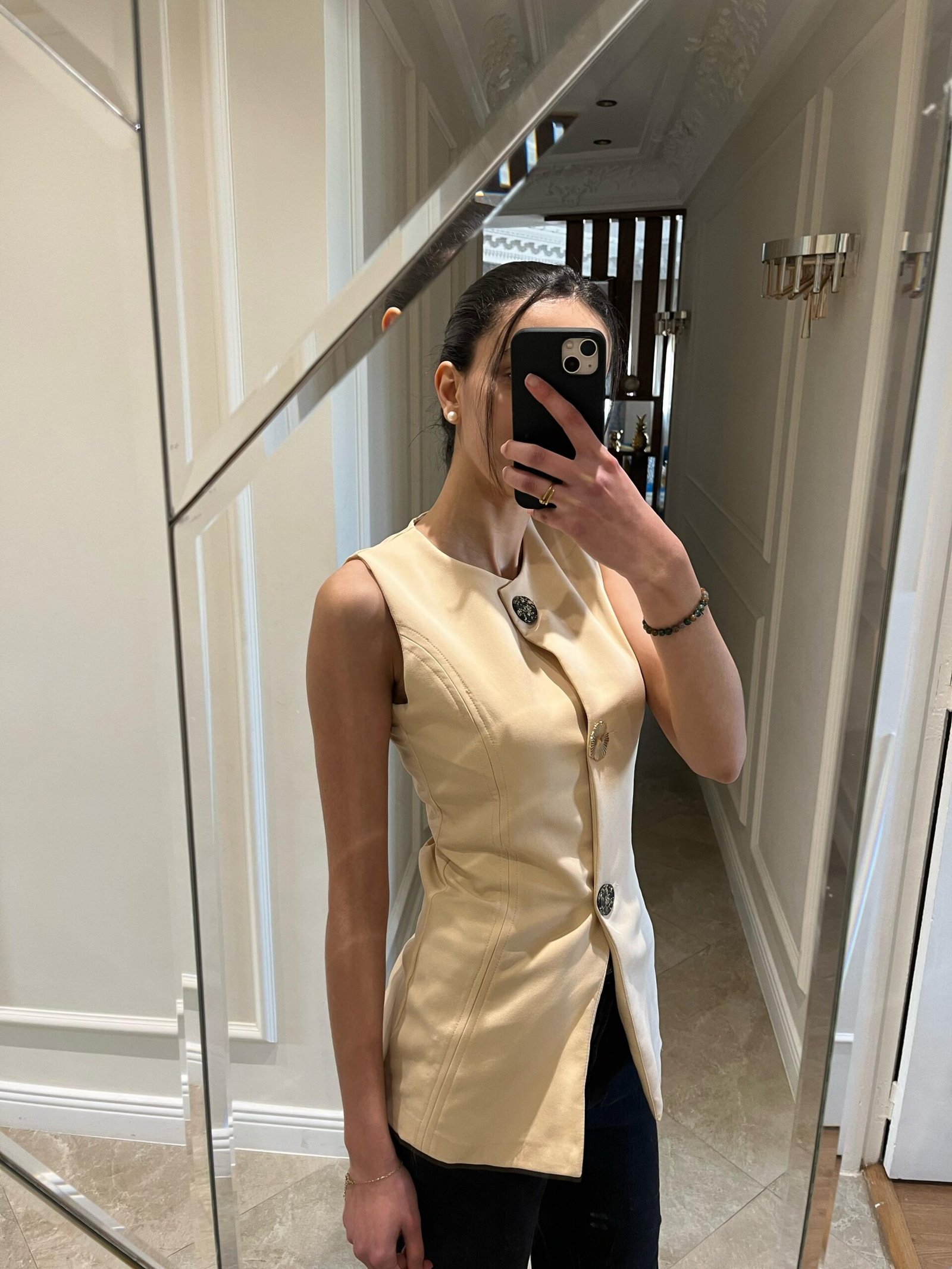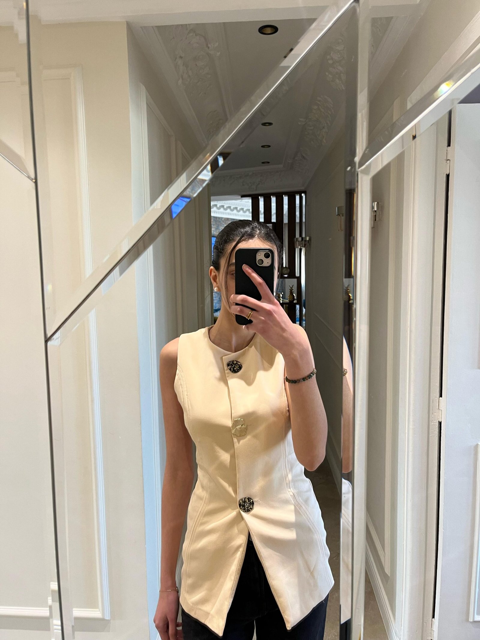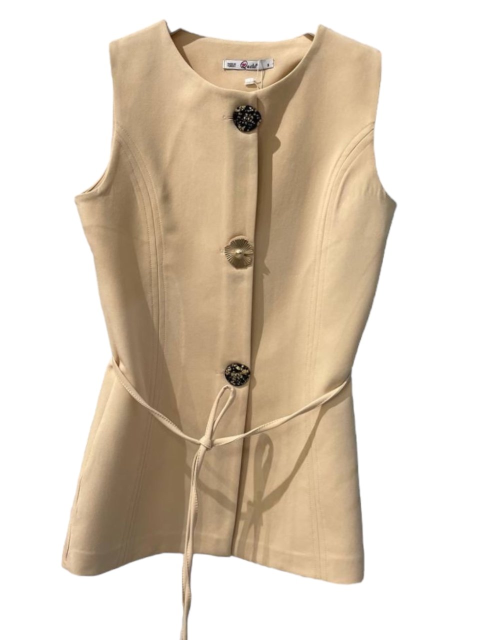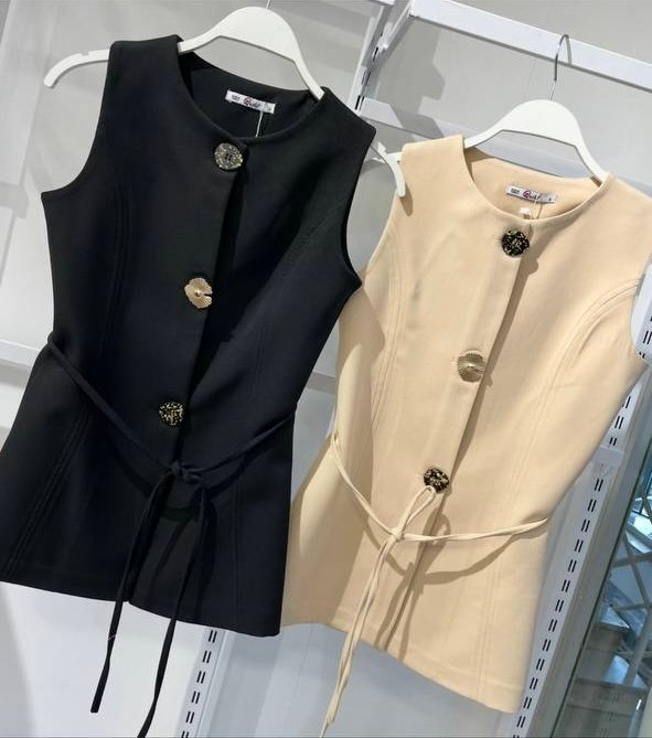 Apportez une touche de raffinement à votre tenue avec ce gilet sans manches. Son tissage dense et légèrement satiné offre un tombé structuré, tandis que sa coupe droite et ceinturée met en valeur la silhouette avec élégance.