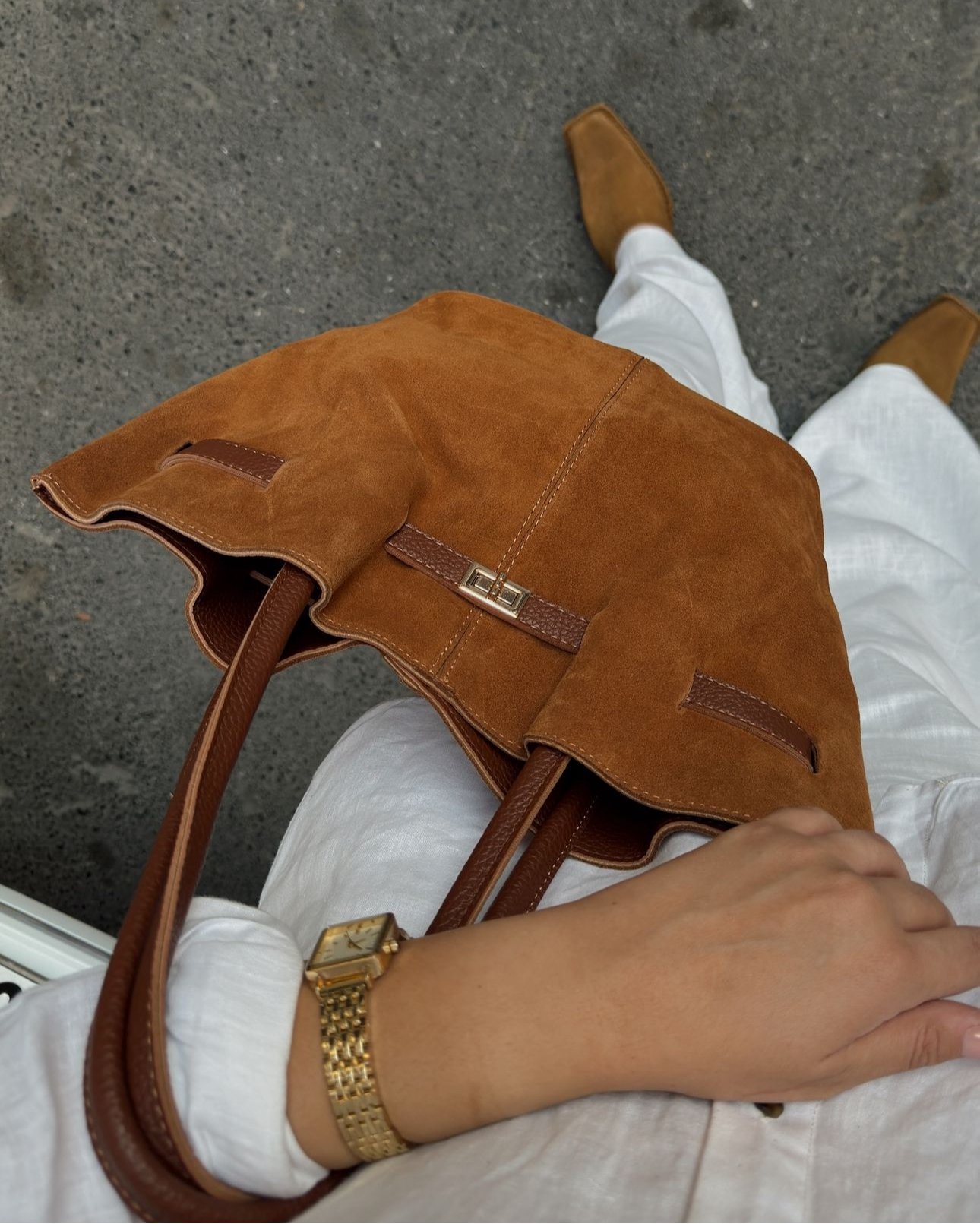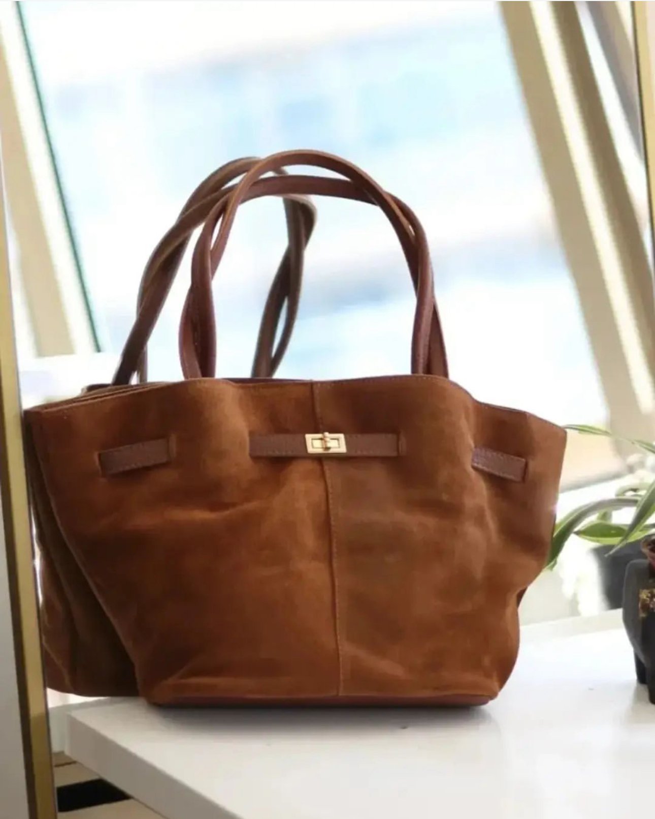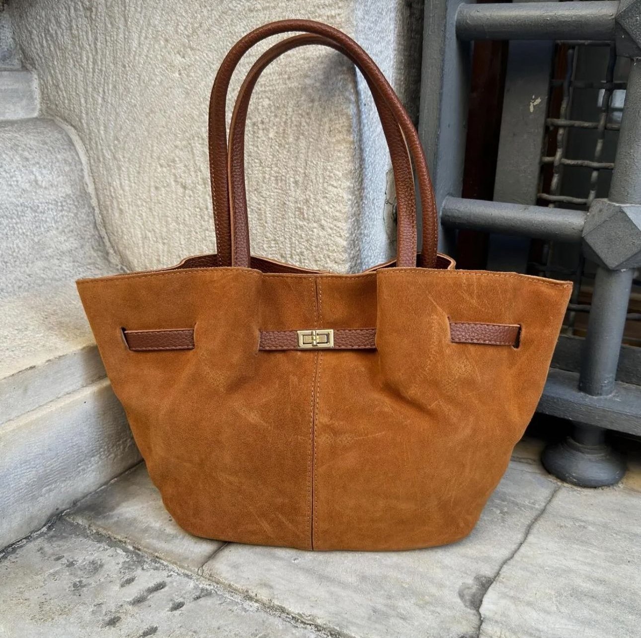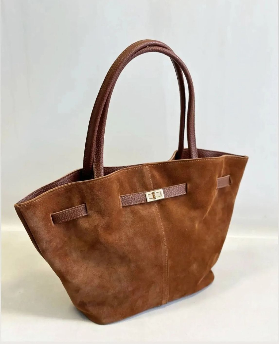 Chic et pratique, ce cabas en daim vert olive séduit par sa silhouette épurée et ses finitions en cuir grainé. Son design élégant, rehaussé d’un fermoir doré discret, en fait un compagnon idéal du quotidien. À porter à la main ou à l’épaule, pour un style raffiné sans effort.